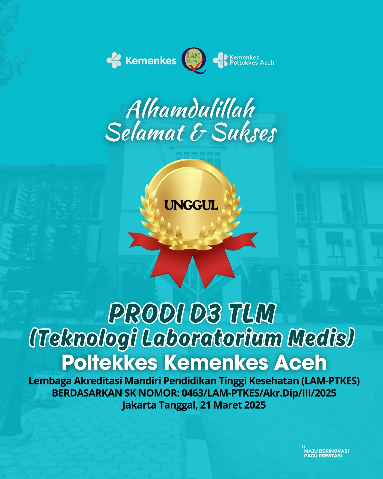Dengan penuh rasa syukur, kami mengumumkan bahwa Program Studi DIII Teknologi Laboratorium Medis di Poltekkes Kemenkes Aceh telah berhasil meraih akreditasi unggul dari Lembaga Akreditasi Mandiri Pendidikan Tinggi Kesehatan (LAM-PTKES). Pencapaian ini merupakan hasil dari dedikasi dan kerja keras seluruh civitas akademika, termasuk dosen, staf, dan mahasiswa.